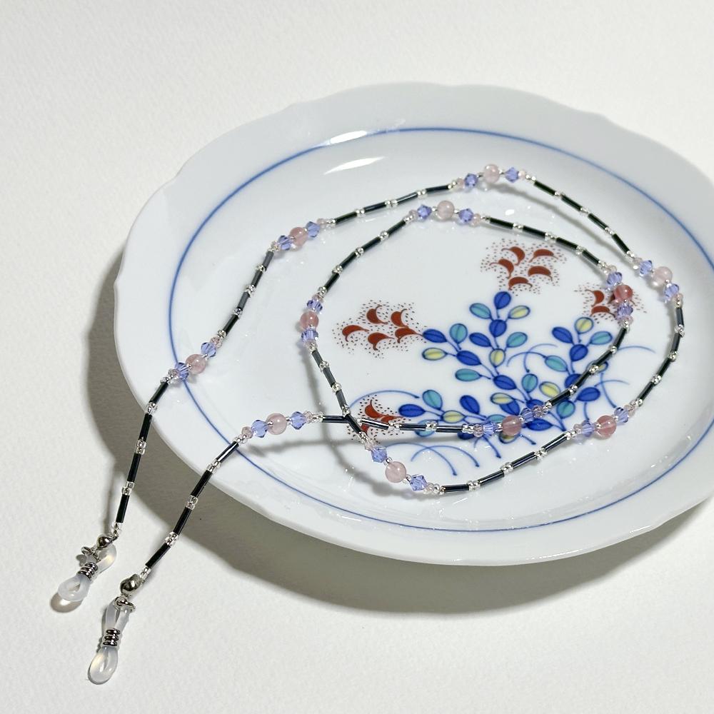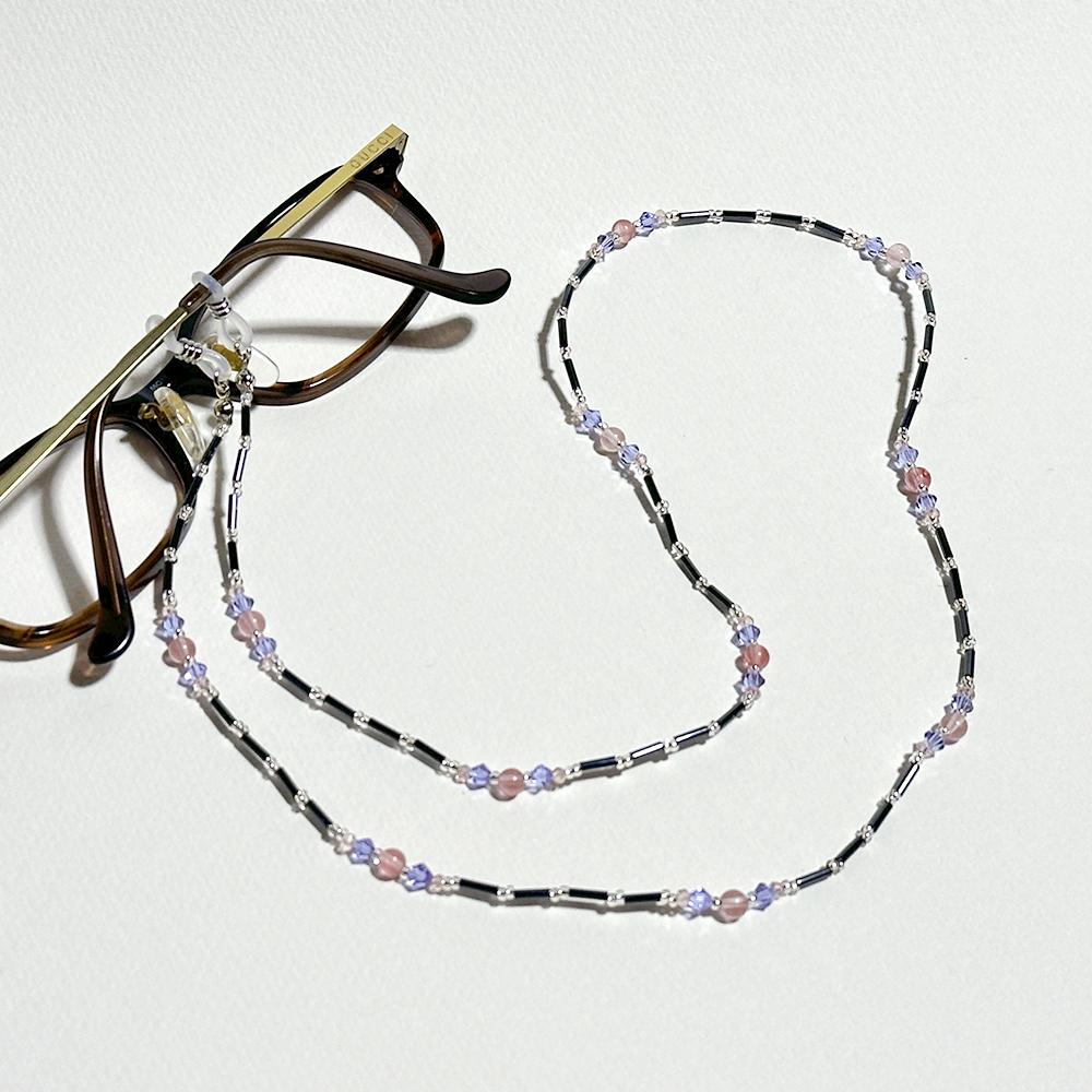 黒で大人っぽさの中に、ピンクと薄いパープルのビーズで可愛らしさを取り入れた、眼鏡チェーンアクセサリーです。